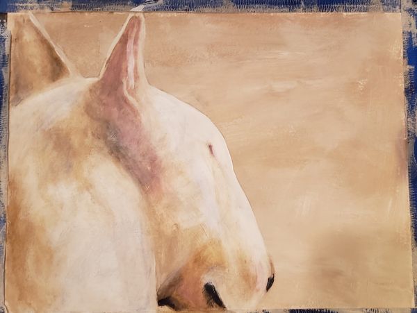 I often paint bull terriers as I have owned and shown them for over 40 years. Bull terriers are among the most comical and appealing of dogs and their faces lend themselves to my art in so many ways.